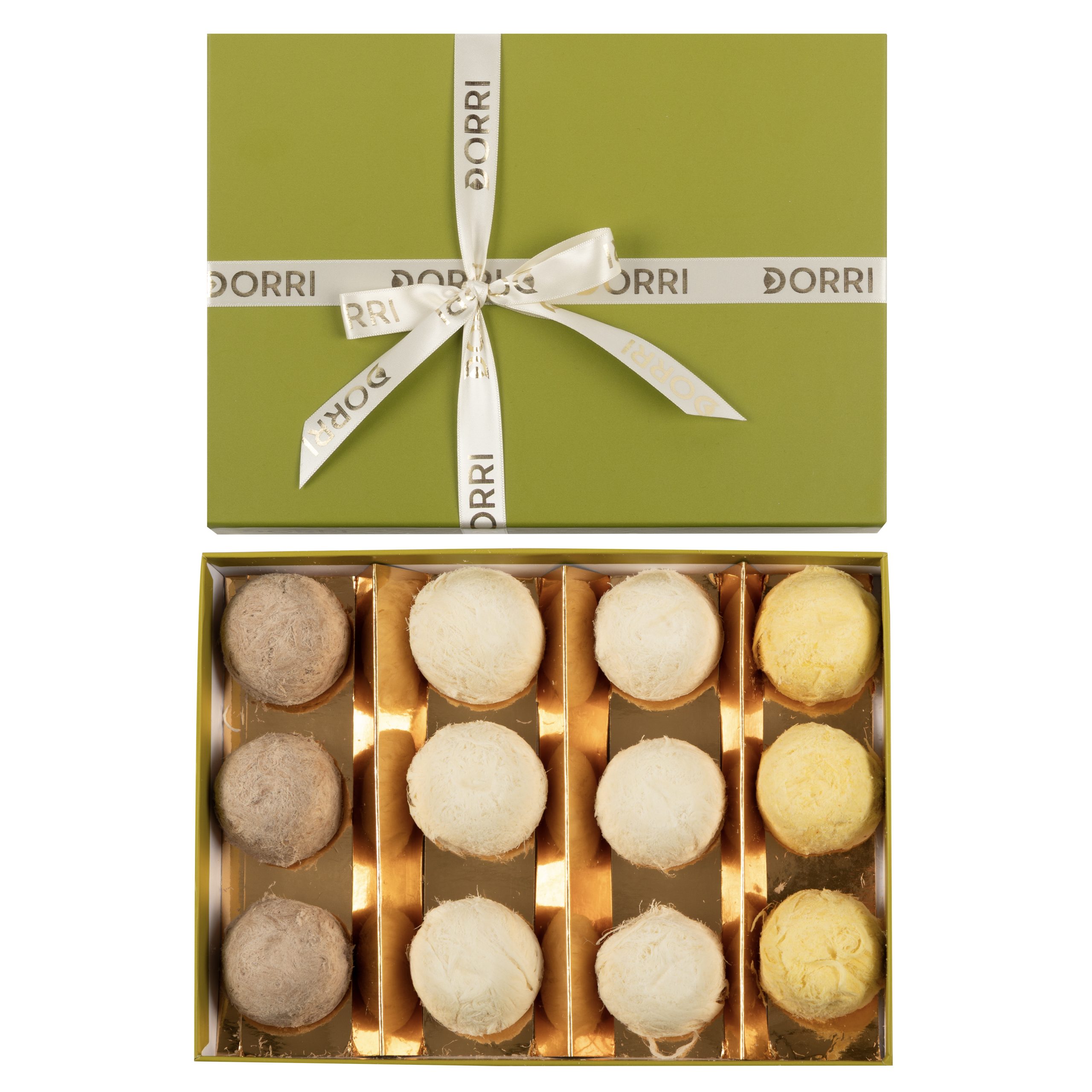 A luxurious assorted gift box featuring 12 pieces of delicate cotton candy (Pashmak) in Vanilla, Saffron, and Chocolate flavours.